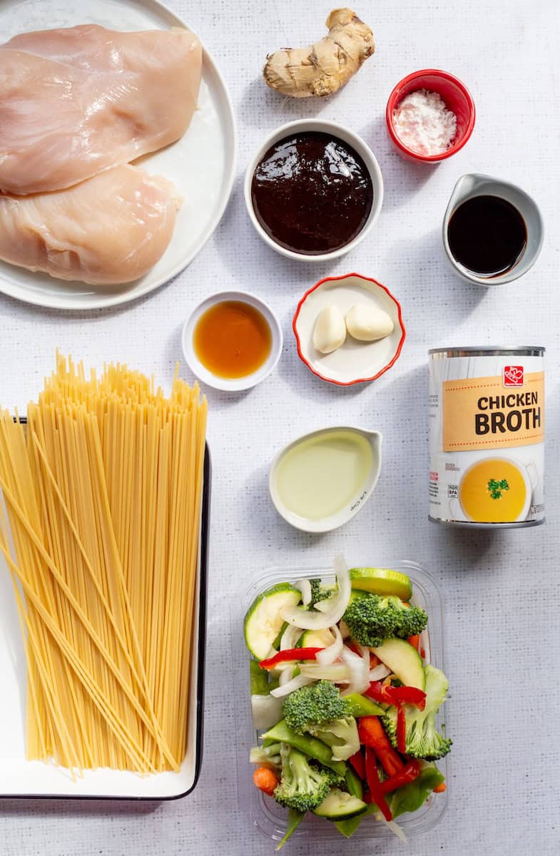 - Stir-fry vegetables - Grab your favorite blend of stir-fry vegetables for this easy pasta dinner. Fresh or frozen mixes are both great options. The blend I used has a mix of broccoli, snow peas, carrots, onion, and red bell peppers.